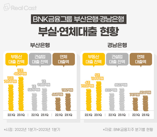 BNK금융그룹이 발표한 분기별 현황 자료에 따르면 부산은행의 올해 1분기 부동산·건설업 대출 잔액은 14조4211억원으로 작년 1분기 12조3630억원보다 16.65% 증가한 것으로 나타났다. 산업별로는 부동산 대출이 10조7954억원에서 12조4825억원으로 15.63%, 건설업 대출이 1조5676억원에서 1조9386억원으로 23.67% 늘었다.