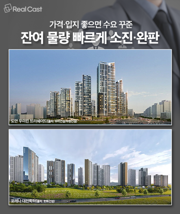 일례로 대전 유성구 학하동에 들어서는 1,754가구 규모의 ‘포레나 대전학하’는 미분양 가구 계약이 전부 완료됐고, 대전 유성구 용계동 도안지구 ‘도안 우미린 트리쉐이드’도 272가구 가량의 미계약 물량을 모두 털어내며 완판됐습니다.