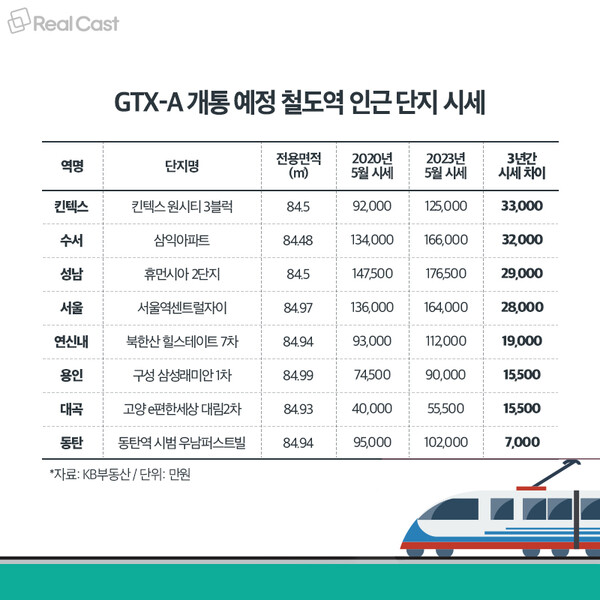수서역 인근의 A 공인중개소 관계자는 “GTX-A노선 개통이 당장 내년으로 다가오면서 인근 단지 문의가 늘었다”라며 “철도 노선은 발표, 착공, 완공 단계마다 집값 상승에 영향을 미치는 만큼 점차적인 상승세가 예상된다”라고 전망했습니다.