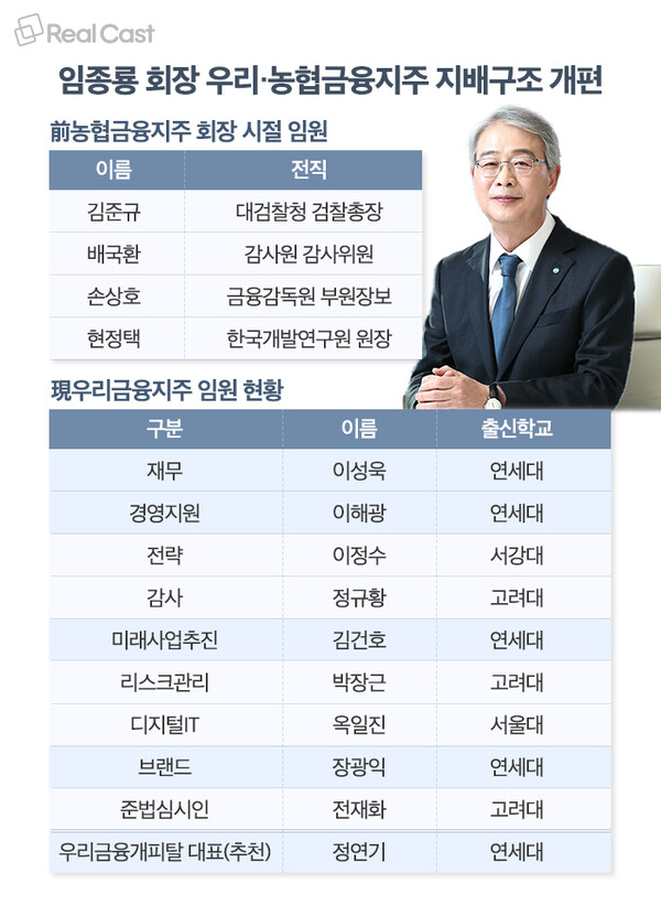 이처럼 임원 절반가량이 연세대 출신으로 채워지면서 과거 임종룡 회장이 NH농협금융지주 회장 시절 단행한 ‘낙하산 인사’가 재현된 것 아니냐는 우려가 우리금융 안팎에서 나오고 있다. 당시 임종룡 회장은 사외이사로 김준규(전 대검찰청 검찰총장), 배국환(전 감사원 감사위원), 손상호(전 금융감독원 부원장보), 현정택(전 한국개발연구원 원장) 등 관료 출신 인사를 대거 선임해 논란을 일으킨 바 있다.