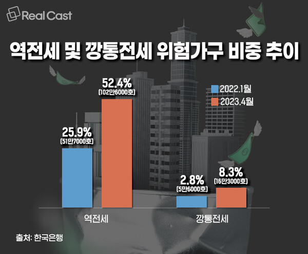 역전세 위험가구 비중은 같은 기간 25.9%(51만7000호)에서 무려 52.4%(102만6000호)로 증가했습니다. 즉 전체 전세 가구 절반 이상이 역전세 위험 요소를 안고 있다는 뜻인데요.