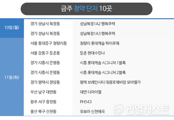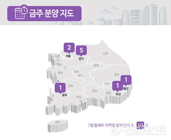 부동산인포에 따르면 7월 2주 신규 청약 및 입주자를 모집하는 곳은 10곳, 총 9,697가구로 집계 됐습니다(총 가구수 기준). 전주 공급물량(총 2,598가구)과 비교하면 3배 이상 늘어난 물량입니다.