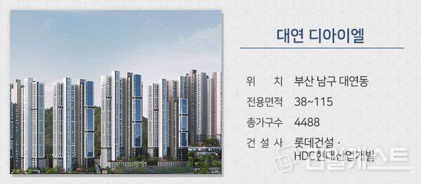 롯데건설과 HDC현대산업개발이 부산 남구 대연동에 짓는 ‘대연 디아이엘’을 분양합니다. 부산지하철 2호선 못골역 역세권이며, 경성대·부경대 대형 상권 인프라가 가깝습니다. 입주민을 위한 실내체육관, 게스트하우스, 실내수영장 등 다양한 커뮤니티 시설도 들어설 예정입니다.