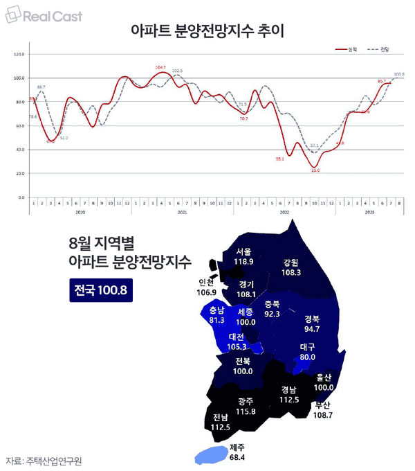 주택산업연구원(주산연)은 한국주택협회와 대한주택건설협회 회원사 등 주택사업자들을 대상으로 설문 조사한 결과, 8월 전국 아파트 분양전망지수는 전월보다 3.3p 오른 100.8을 보였다고 밝혔습니다.