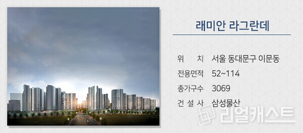 삼성물산이 서울 동대문구 이문동에 짓는 ‘래미안 라그란데’를 분양합니다. 총 3069가구의 대단지로 이중 일반분양이 920가구입니다. 지하철 1호선 외대앞역, 신이문역 역세권이며, 청량리역 일대 대형 상업시설 및 상권을 이용하기도 쉽습니다. 인근에 다수의 초중고교와 대학교가 위치해 교육환경이 우수하다는 평가입니다.