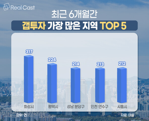 부동산 빅데이터 업체 아실에 따르면, 22일 기준 지난 6개월간(2023년 3월 이후) 전국에서 갭투자가 가장 많았던 지역 1위는 경기 화성시로 전체 매매거래(4936건)의 6.4%인 317건이 갭투자였습니다. 이어 평택(224건), 성남 분당구(214건), 인천 연수구(213건), 경기 시흥(212건) 순으로 집계됐습니다.