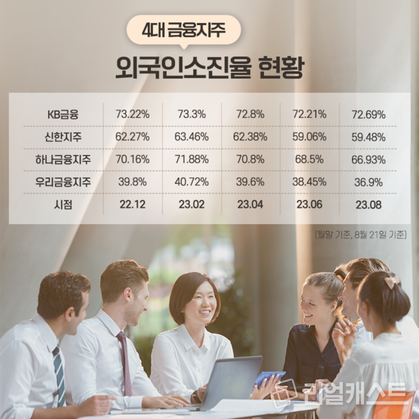 외국인 소진율과 관련해 금융권 관계자는 “4대 금융지주 주식을 많이 보유하고 있다는 것은 다수의 외국자본이 한국에서 운용되고 있는 것으로 배당을 통해 빠져나가는 역기능적인 면보다는 자본유치에 순기능적이 크다고 생각한다”면서 “금융지주의 경우 꾸준히 성장하고 있고 배당도 많이 지급하는 편이다보니 외국인들의 지속적인 관심을 받고 있는 것으로 보이는데 외국인뿐만 아니라 우리나라 투자자들도 금융지주 주식에 관심을 가져주셨으면 좋겠다”라고 말했습니다.