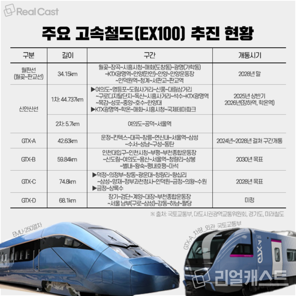 ‘EX100’는 KTX만 있는 것이 아닙니다. 현재 공사 중인 고속철도들이 있는데 대표적인 것이 월곶~판교선, 신안산선, GTX(수도권광역급행철도) 등입니다.