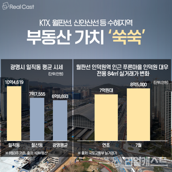 광명시 변방에 있던 일직동은 KTX 광명역이 들어서고 주변으로 아파트와 상업시설 및 편의시설이 자리 잡으면서 천지개벽했습니다. KB부동산 시세에 따르면 일직동의 평균 시세는 10억4,619만원으로 광명시에서 가장 집값이 비싼 곳이 됐습니다(8월 2주기준). 차순위인 철산동(7억7,555만원) 보다도 2.5억원 가량 높습니다.
