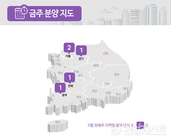 부동산인포에 따르면 9월 1주 신규 청약 및 입주자를 모집하는 곳은 5곳, 총 1964가구로 집계됐습니다(총 가구수 기준).