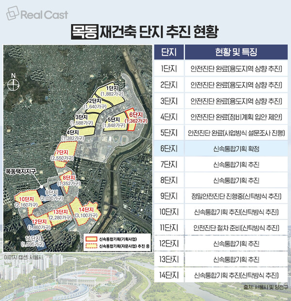 현재 목동에선 7·8·10·12·13·14단지 등 총 6개 단지가 신통기획을 추진하고 있고, 9·11단지를 제외한 나머지 단지들은 안전진단을 완료한 상태입니다.