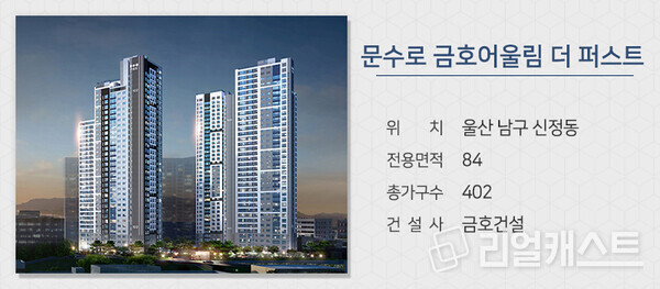 금호건설이 울산 남구 신정동에 짓는 ‘문수로 금호어울림 더 퍼스트’를 분양합니다. 주거 선호도가 높은 신정생활권으로 공업탑 로터리를 통해 차량 이동이 쉽습니다. 인근에 중앙초, 신정초, 월평중, 학성중, 울산여고, 학성고, 신정고 등 울산의 명문학교들이 위치하고, 울산대공원도 도보권이어서 쾌적합니다.
