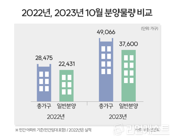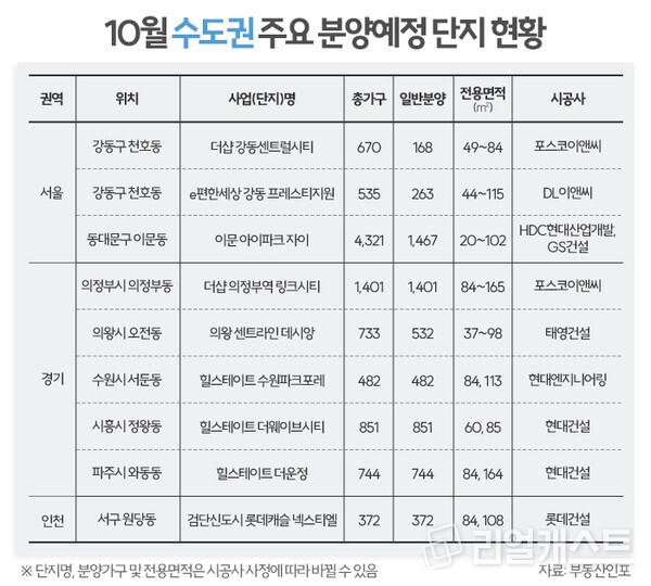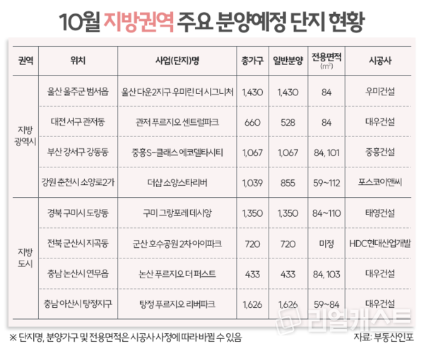 부동산시장 분석업체 부동산인포에 따르면 10월 중 전국 54곳에서 총 4만9,066가구가 분양에 나설 계획이다. 이중 조합원분 등을 제외한 3만7,600가구가 일반분양된다.