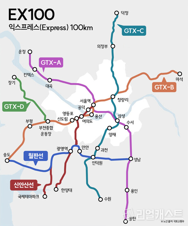 교통 선호 현상은 이미 부동산 트렌드에 반영되고 있습니다. 그 중 대표적인 예가 부동산 시장분석 업체 부동산인포에서 제시한 'EX100'입니다. EX100은 익스프레스(Express) 100km의 약자로, 시간당 100km 이상 이동할 수 있는 고속철도를 의미합니다. GTX(수도권 광역철도) 및 월곶~판교선(월판선)이 이에 해당합니다.