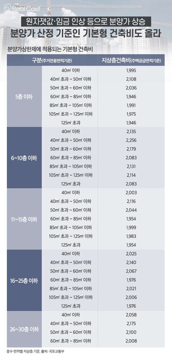 국토교통부에 따르면 분양가상한제 주택의 분양가 산정에 활용되는 기본형 건축비(16~25층 이하, 전용면적 60㎡ 초과~85㎡ 이하 지상층 기준)는 최근 1㎡당 194만3000원에서 197만6000원으로 1.7% 올랐습니다.