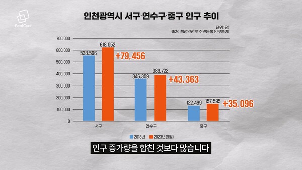 실제로 현행 서구 인구는 올해 9월 기준 61만 8천 명에 달합니다. 2018년 대비 14% 이상 늘었죠. 5년 사이 약 8만 명의 인구가 늘어난 셈으로, 같은 기간 중구(영종하늘도시)와 연수구(송도국제도시)의 인구 증가량을 합친 것보다 많습니다.