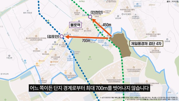 핵심은 불로역(예정)입니다. 인천은 검단로-고산후로 삼거리를 주장하고 있고, 김포는 불로대곡동 행정복지센터 앞 삼거리를 주장하고 있는데요. 어느 쪽이든 단지 경계로부터 최대 700m를 벗어나지 않습니다.
