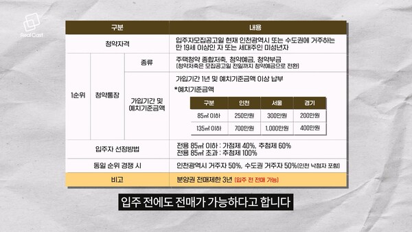 청약통장 가입 기간 1년에 지역∙면적별 예치금을 맞추면 1순위로 청약할 수 있습니다. 낮은 가점을 걱정할 필요는 없습니다. 전용 84㎡는 추첨제가 60%, 전용 110㎡는 추첨제 100%로 당첨자를 선정하기 때문에 당첨 확률도 높죠. 전매제한은 3년인데, 입주 전에도 전매가 가능하다고 합니다. 입주 예정일이 여유롭게 잡혔거든요. 경쟁이 치열하겠네요.