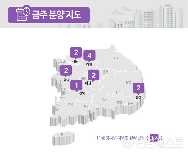 부동산인포에 따르면 11월 1주 신규 청약 및 입주자를 모집하는 곳은 12곳, 총 1만1987가구로 집계됐습니다(총 가구수 기준).