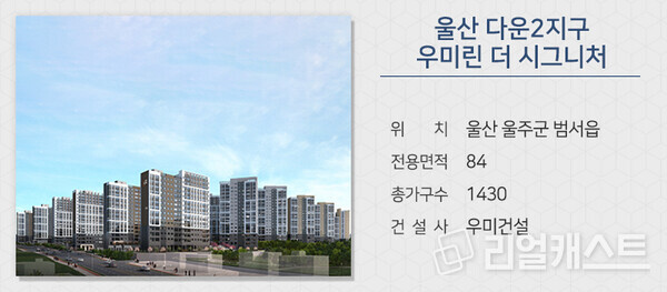 울산 울주군에서는 우미건설이 ‘울산 다운2지구 우미린 더 시그니처’를 분양합니다. 다운2지구 첫 대단지로 도보권에 초•중•고교를 비롯해 상업시설, 근린공원 등이 있어 주거 환경이 우수하다는 평가입니다.