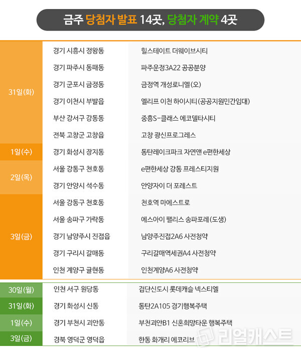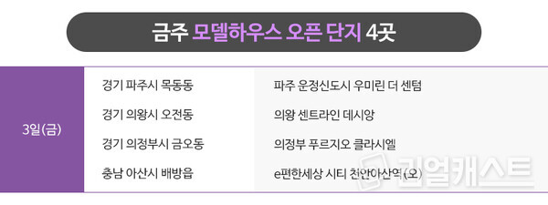 금주 모델하우스 오픈 예정 현장은 총 4곳입니다. 각각 경기 3곳과 충남 1곳 등입니다.