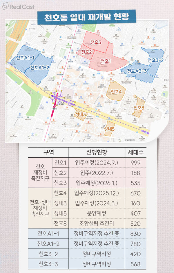 천호동이 새롭게 평가되면서 향후에 남은 정비사업에도 관심이 쏠리는데요. 아쉽게도 일대 재정비촉진지구 사업은 거의 끝나가고 있습니다.