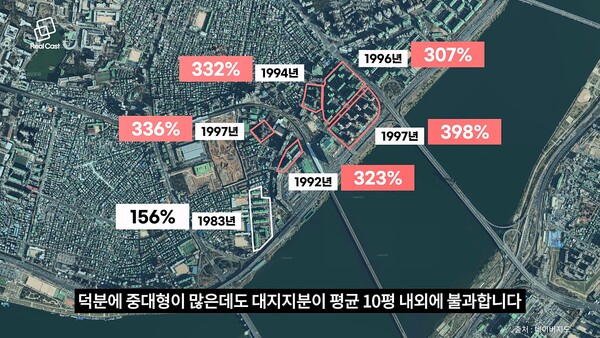 아파트들이 아직 재건축 연한인 30년을 채우려면 몇 년 남기도 했지만, 무엇보다도 일대 단지들의 용적률이 이미 너무 높습니다. 300~400%까지 아파트를 쌓아 놨고, 덕분에 중대형이 많은데도 대지지분이 평균 10평 내외에 불과합니다.