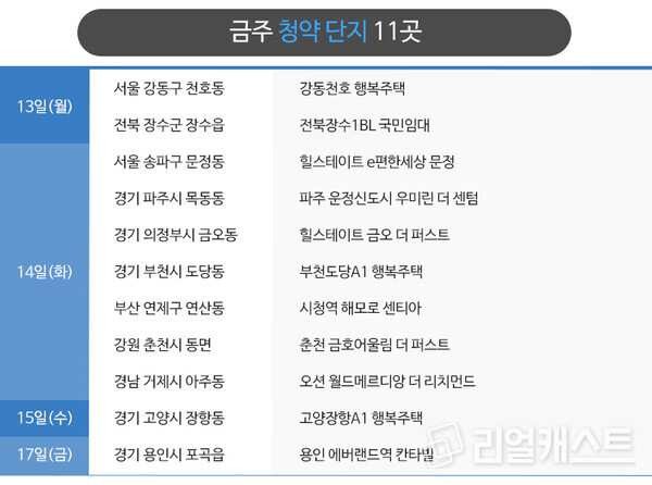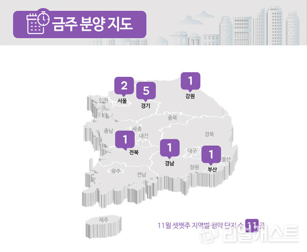 부동산인포에 따르면 11월 3주 신규 청약 및 입주자를 모집하는 곳은 11곳, 총 5564가구로 집계됐습니다(총 가구수 기준).