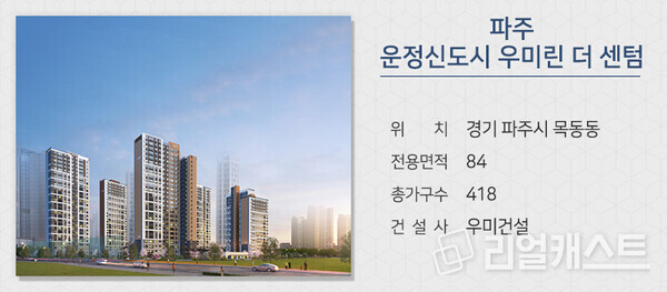 우미건설은 경기 파주 운정신도시에서 ‘파주 운정신도시 우미린 더 센텀’을 분양합니다. 분양가 상한제가 적용되는 단지로 GTX-A 운정역(가칭) 역세권입니다. 홈플러스, 롯데아울렛 등 대형 상업시설을 비롯해 도서관(예정), 초·중·고교 부지 등 풍부한 인프라를 쉽게 이용할 수 있습니다.