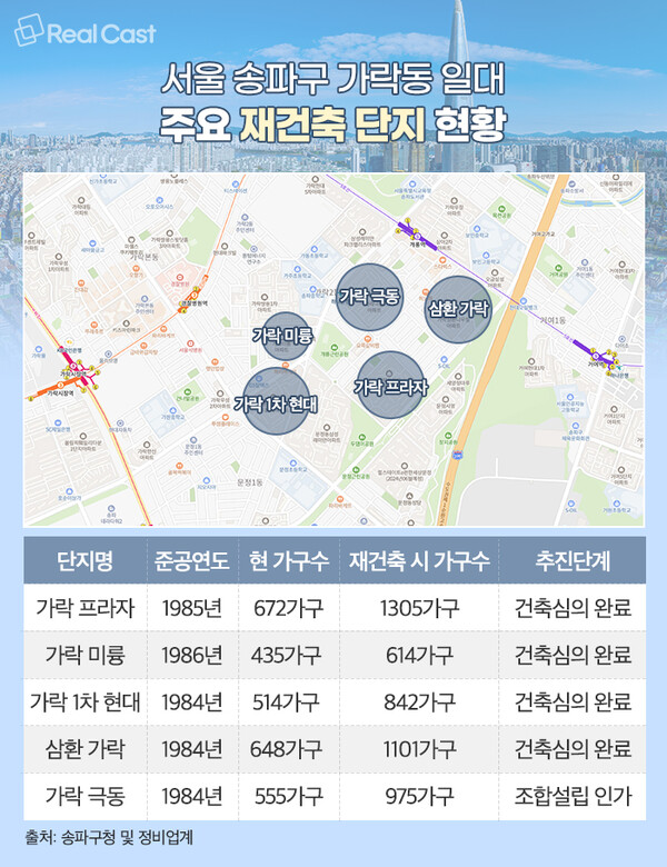 실제 송파구에 따르면 구에서 사업시행인가를 추진 중인 재건축 아파트는 총 11곳입니다. 이중 주목 받는 곳이 가락동 인근 5개 단지입니다. △가락프라자(1985년, 672가구) △가락미륭(1986년, 435가구) △가락1차현대(1984년, 514가구) △삼환가락(1984년, 648가구) △가락극동(1984년, 555가구) 등이 조합설립인가 또는 건축심의를 완료했는데요.