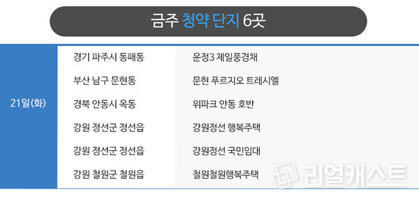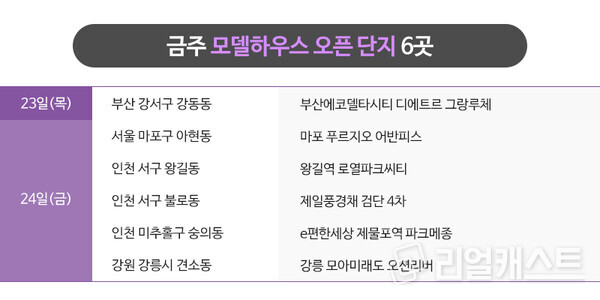 금주 모델하우스는 총 6곳이 오픈 될 예정입니다. 권역별로 수도권 4곳, 지방 2곳입니다.