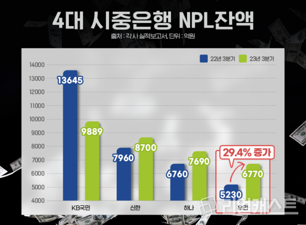 세부적으로 살펴보면 우리은행이 올해 3분기 NPL잔액은 6770억 원으로 지난해 동기(5230억 원) 대비 1540억 원(29.4%)이 늘어나며 4대 시중은행 가운데 가장 큰 폭으로 증가한 것으로 확인됐습니다. 이어 하나은행이 같은 기간 930억 원(6760억 원→7690억 원), 신한은행도 동기간 740억 원(7960억 원→8700억 원) 늘어난 것으로 조사됐습니다.