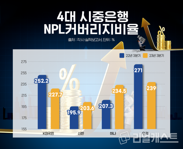 반면 하나은행과 신한은행의 NPL커버리지비율은 높아진 것으로 확인됐습니다. 하나은행의 NPL커버리지비율은 22년 3분기 207.3%에서 올해 3분기는 234.5%로 27.2%p 상승했습니다. 신한은행 역시 같은 기간 7.7%p(195.9%→203.6%) 올랐습니다.