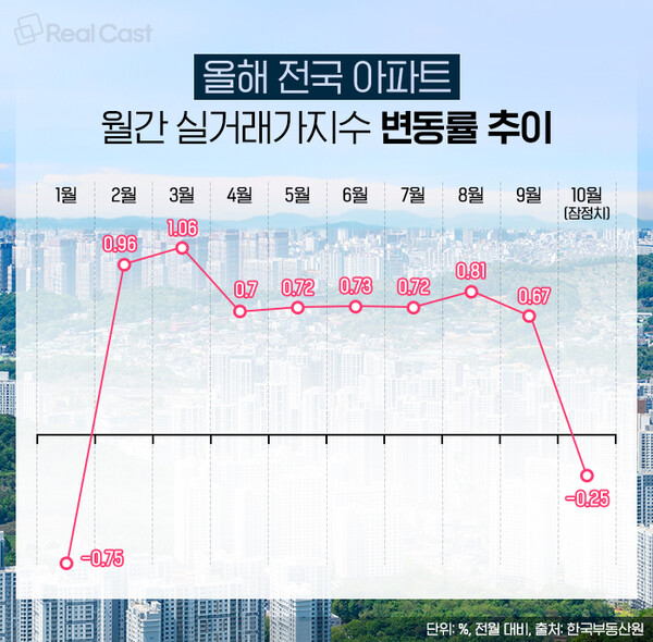 한국부동산원의 10월 아파트 실거래지수(잠정치)에 따르면, 9월 대비해서 △전국 -0.25% △서울 -0.45% △수도권 -0.35% △지방 -0.14% 등으로 조사됐습니다. 일부 지역을 제외하고 모두 하락세입니다.