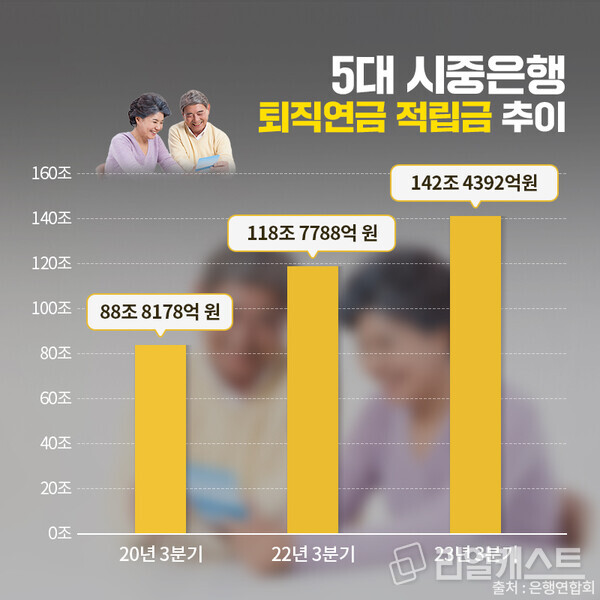 은행연합회 퇴직연금 수익률 비교에 따르면 올해 3분기 기준 5대 시중은행(KB국민, 신한, 하나, 우리, NH농협)의 퇴직연금 적립금은 142조 4392억 원으로 나타났습니다. 이는 1년 전에 비해 19.9%(23조 6604억 원) 증가한 금액이며 3년 전(88조 8178억 원)보다는 60.3% 늘어난 수준입니다.