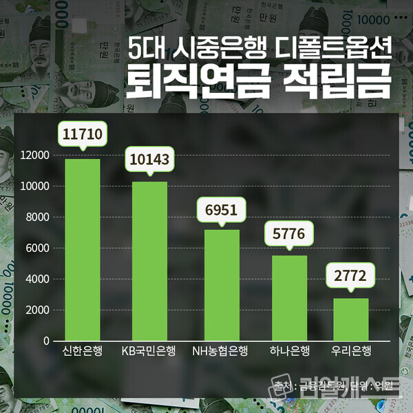 이외에도 NH농협은행(6951억 원), 하나은행(5776억 원), 우리은행(2722억 원) 순으로 디폴트옵션퇴직연금 누적 적립금이 많은 것으로 확인됐습니다.