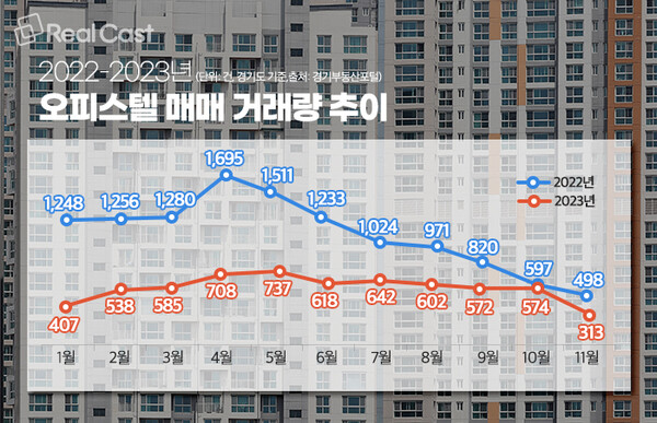 경기부동산포털 통계에 따르면, 올해(1~11월) 경기 오피스텔 누적 거래량은 총 6296건으로 집계됐습니다. 전년 동기(12,133건)와 비교하면 절반 수준에 그친 셈입니다.