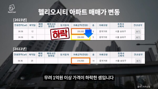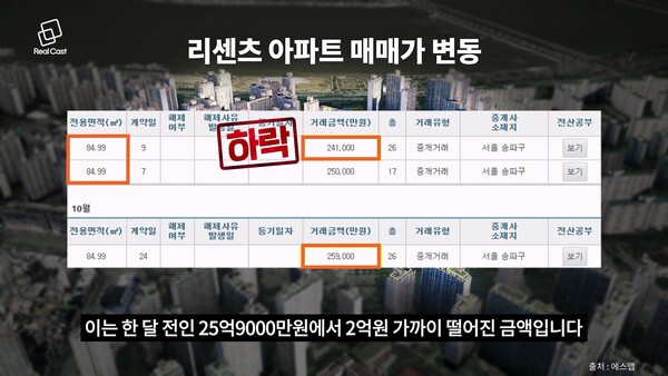수요자들에게 주거 선호도가 높은 곳임에도 불구 송파구는 억 단위로 거래가가 떨어지고 있습니다. 이상 신호가 감지되고 있는 송파 부동산시장을 리얼캐스트TV에서 살펴봤습니다.