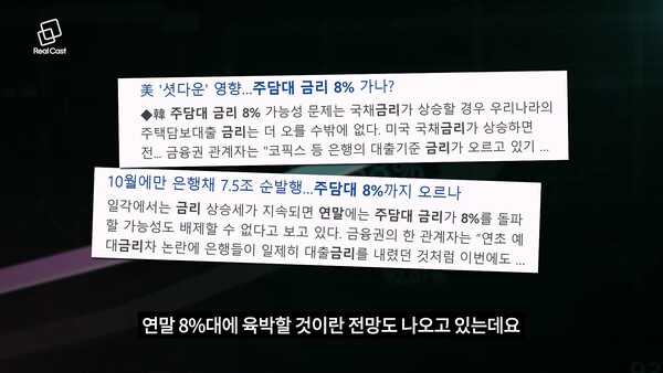 지난 8월까지만 해도 금리 하단이 4%대 초반이었지만, 현재 시중은행 주택담보대출 변동형 금리 상단은 7%대 수준입니다. 연말 8%대에 육박할 것이란 전망도 나오고 있는데요.