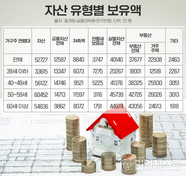 가구주 연령대가 높을수록 전체 자산 중 실물자산이 차지하는 비중이 높았으며 50대 가구가 6억 452만 원으로 가장 많은 자산을 보유하고 있는 것으로 나타났습니다.