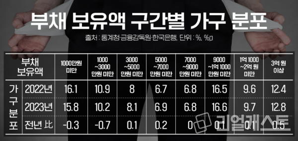 부채 보유액 구간별로는 1억 1000만 원~2억 원 미만에서 부채 보유가구 비율이 16.6%로 가장 높았으며, 1000만 원~3000만 원 미만인 경우가 15.8%로 뒤를 이었습니다. 부채 보유액이 3억 원 이 넘는 가구도 12.8%나 되는 것으로 확인됐습니다.