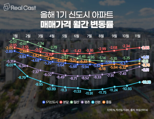 민간 통계를 봐도 1기 신도시 집값은 뚜렷한 내림세를 보이고 있습니다. 부동산R114에 따르면 1기 신도시 집값 변동률은 전년 대비 △분당 -2.05% △일산 -5.11% △평촌 -6.51% △산본 -10.18% △중동 -5.76% 등 약세를 지속하고 있습니다. 분당을 제외한 모든 지역이 1신 신도시 전체 낙폭(-4.81%)보다 컸습니다.