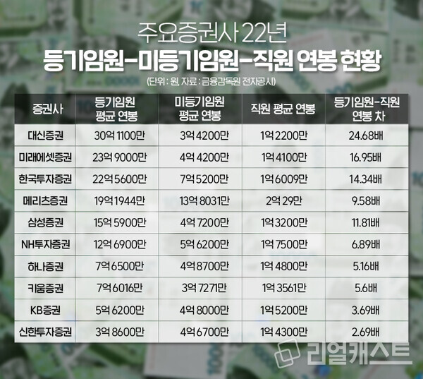 국내 주요 증권사의 등기임원과 직원의 평균 연봉이 작년말 기준 9.85배 차이 나는 것으로 확인됐습니다.