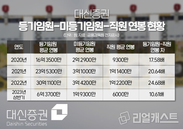대신증권은 등기임원의 평균 연봉은 업계 최고 수준인 반면, 직원 평균 연봉은 1억 2200만 원으로 주요 증권사 중 최하위를 기록했습니다.