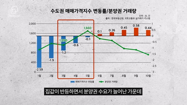 다만 전매제한 완화의 효과는 오래가지 못했습니다. 2달 정도 반짝 거래량이 늘었지만, 하반기에 접어들면서 다시 가파르게 감소하기 시작했죠. 전매제한은 완화되었지만 분양가 상한제 단지에는 실거주 의무가 건재하고, 단기양도차익의 양도세 중과도 해결되지 않아 거래가 성사되기 어려웠습니다.