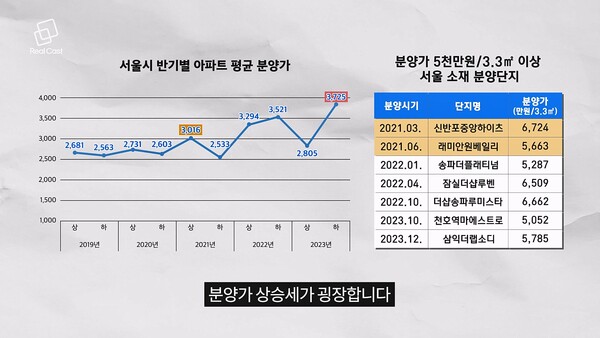 이 단지만의 경향도 아닙니다. 부동산114 자료에 따르면 올 하반기 서울에서 분양한 아파트의 평균 분양가는 3.3㎡당 3,725만 원에 달합니다. 잠원동 신반포중앙하이츠나 래미안원베일리가 분양한 2021년 상반기에도 평균 3,016만 원이었는데, 분양가 상승세가 굉장합니다.