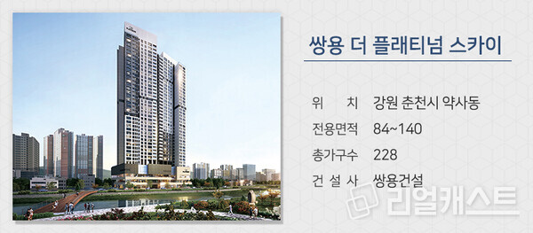 쌍용건설이 강원 춘천시 약사동에 짓는 ‘쌍용 더 플래티넘 스카이’를 분양합니다. 최고 39층 주상복합 단지로 약사천 조망이 가능합니다. 봉의초, 춘천중학교가 도보권입니다. 경춘선 남춘천역을 이용해 서울 등으로 이동이 쉽고, 중앙고속도로, 서울양양고속도로 등을 통해 타지역으로 이동이 편리합니다.