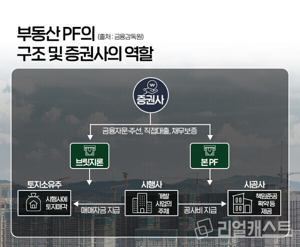 사업 주체인 시행사는 본 PF로 초기 브릿지론을 상환하고, 착공 이후엔 분양수입금 또는 자산매각 대금 등으로 본PF를 상환하는 절차로 진행됩니다. 이때 증권사는 시행사나 다수 관계자 사이에서 대출기관을 주선하거나 PF구조를 자문하기도 하며 직접 대출이나 채무보증을 취급하는 등 중간자적 역할을 수행하기도 합니다.