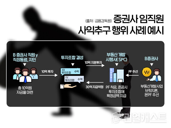 이번 기획검사에서 증권사 임직원의 사익추구 행위가 여러 건 적발됐습니다. 일례로 A증권사 임원 x씨는 토지계약금대출 취급과 브릿지론 및 본PF 주선 등을 수행하며 알게 된 사업장 개발 진행정보 등을 이용했습니다. x씨가 사실상 지배하고 있는 법인을 통해 시행사 최대주주가 발행한 CB(전환사채)를 수천만 원에 취득하고 이를 약 500억 원에 되팔며 500억 상당의 이익을 부당 편취했습니다. 사업부지가치 상승 등에 따른 향후 사업 예상 수익을 미리 예상하고 개발사업 완료 전 사익을 추구한 것입니다.