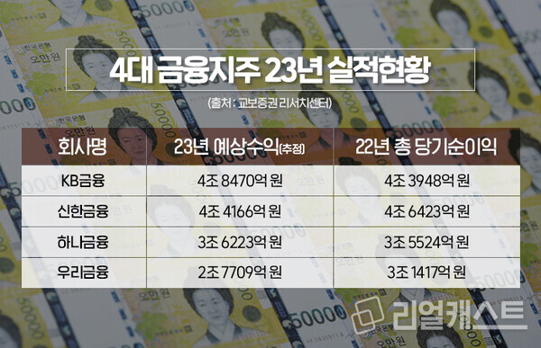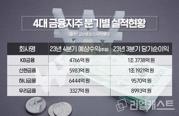 이렇다 보니 4대 금융지주의 23년 4분기 실적은 전분기 대비 크게 감소할 것으로 확인됐습니다.